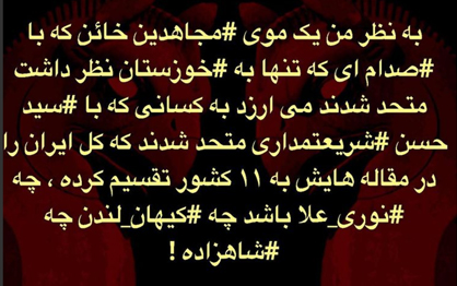 به نظر من یک موی #مجاهدین خائن که با #صدام ای که تنها به #خوزستان نظر داشت متحد شدند می ارزد به کسانی که با #سید حسن #شریعتمداری متحد شدند که کل ایران را در مقاله هایش به ۱۱ کشور تقسیم کرده ، چه #نوری_علا باشد چه #کیهان_لندن چه #شاهزاده !