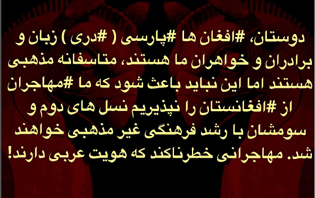 دوستان، #افغان ها #پارسی ( #دری ) زبان و برادران و خواهران ما هستند، متاسفانه مذهبی هستند اما این نباید باعث شود که ما #مهاجران از #افغانستان را نپذیریم نسل های دوم و سومشان با رشد فرهنگی غیر مذهبی خواهند شد. مهاجرانی خطرناکند که هویت عربی دارند!